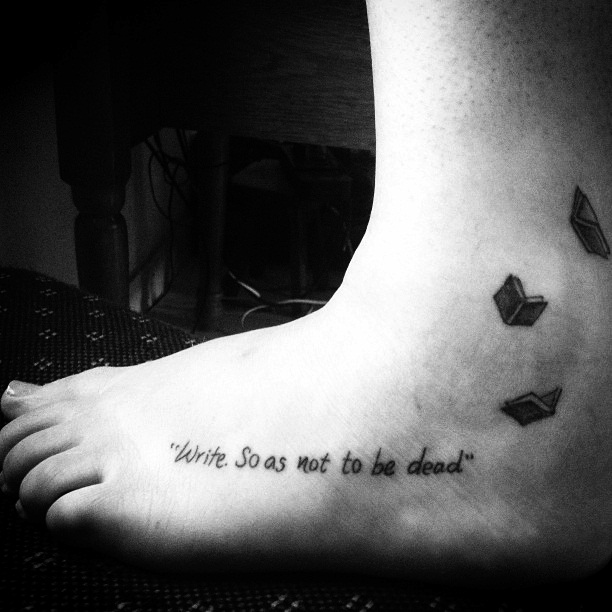 This is my first tattoo. It’s a phrase from Ray Bradbury’s book called ‘The Illustrated Man’. For me write it’s everything I have, I dropped out of Law school to become a writer and my family got mad with me, but I don’t regret. Life for me is writing.